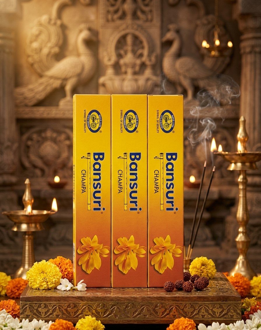 Infuse your space with the celestial aroma of Bansuri Champa, a fragrance inspired by the sacred Champa flower and the soul-stirring melodies of the divine flute. This premium incense is crafted to transport you to the peaceful corridors of an ancient temple. Presented here in its natural element—surrounded by traditional marigolds, sacred rudraksha, and the warm glow of brass diyas—it is more than just a scent; it is an invitation to mindfulness and spiritual connection.