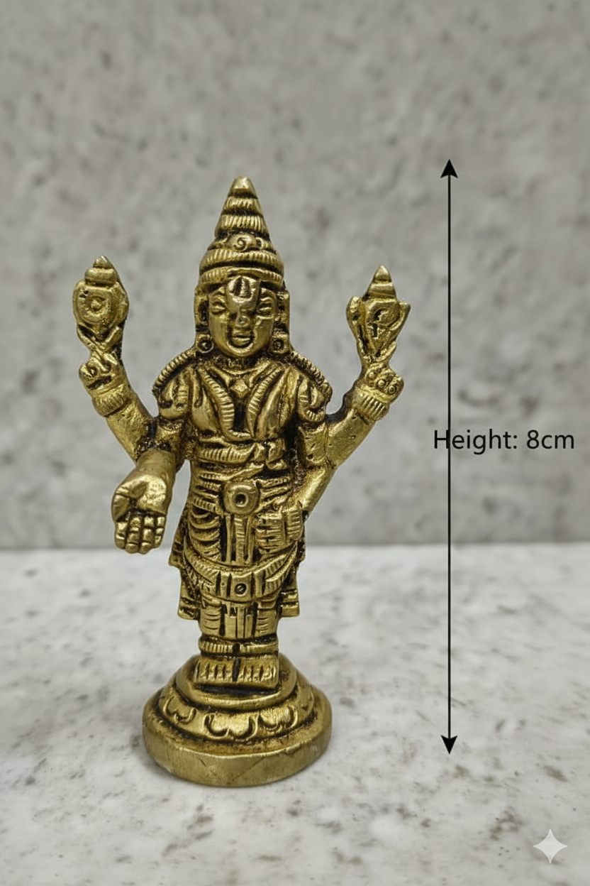 Invite the blessings of preservation, protection, and prosperity into your space with this intricately detailed miniature brass idol of Lord Vishnu (Hari). Perfect for travelers, small altars, car dashboards, or adding a touch of devotion to your work area. This idol is a powerful reminder of the omnipresent divine power.