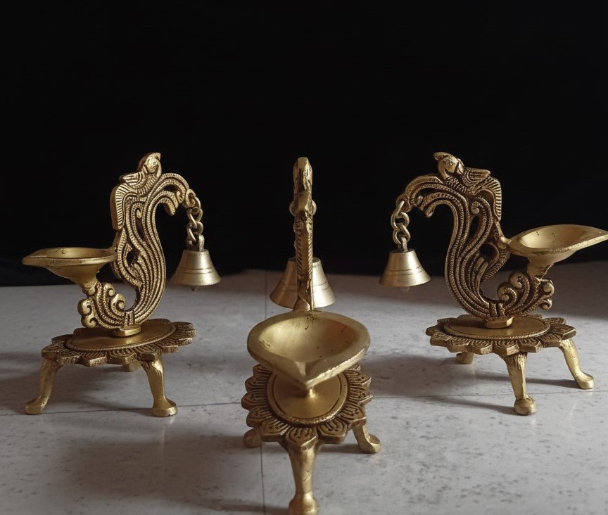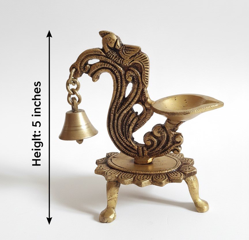 Be the first to review “Handcrafted Brass Peacock Bell Diya (5 Inch) – Decorative Standing Oil Lamp with Hanging Bell and Tripod Floral Base” Cancel reply
