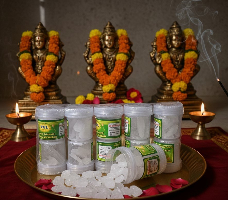 This product appears to be Natural Camphor (often referred to as Pachai Karpooram or Kapur in a spiritual context). It is presented as small, white, translucent, crystalline pieces. The camphor is packaged in a clear, small plastic jar or container, and it is likely sold in a 10g quantity (pack of 2 nos) (as requested) or as a small stack of individual containers. Camphor is traditionally used in various religious ceremonies (puja) for its clean-burning properties and distinct, sharp, and purifying aroma, which is said to cleanse the environment and invoke positive energy.