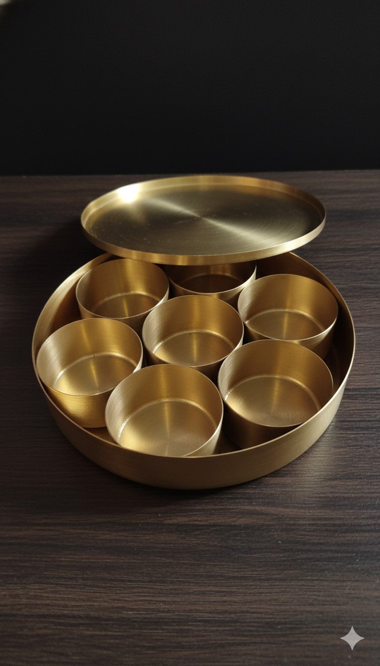 • 7-in-1 Compartments: Includes seven removable inner bowls that fit perfectly within the main container, topped with a snug-fitting brass lid.