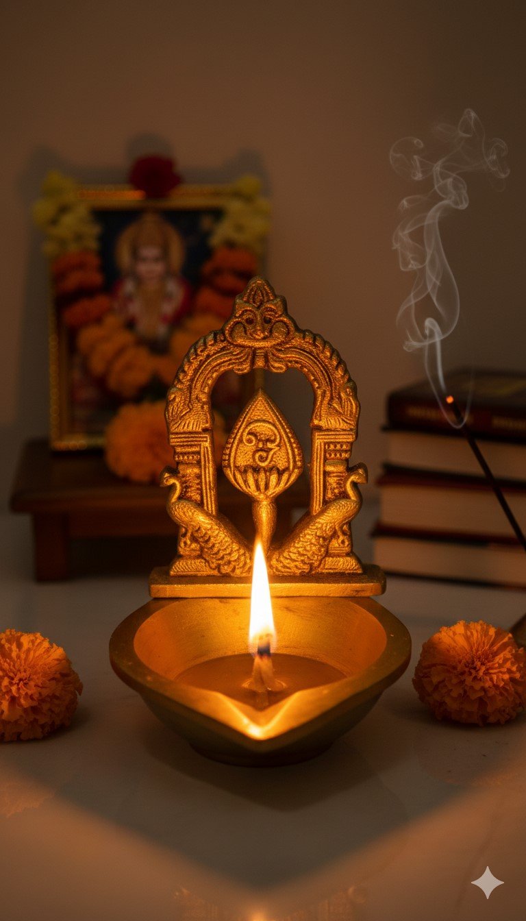 The Power of the Vel: The Vel represents the sharp and deep intellect required to overcome life’s obstacles. Lighting this diya is believed to activate the “Skanda” energy, shielding the home from negative influences.