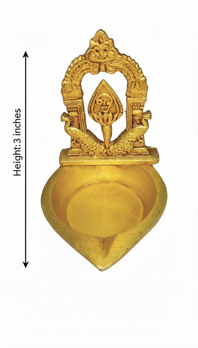 Illuminate your home with the protective and victorious energy of Lord Murugan using this exquisitely handcrafted Brass Vel Diya. Standing at 3 inches, this unique deepam features the sacred Vel (spear)—the symbol of divine wisdom and triumph—flanked by two majestic Peacocks, the Lord’s celestial vahana. This diya is more than just a lamp; it is a powerful spiritual tool designed to bring mental clarity and courage to your household.