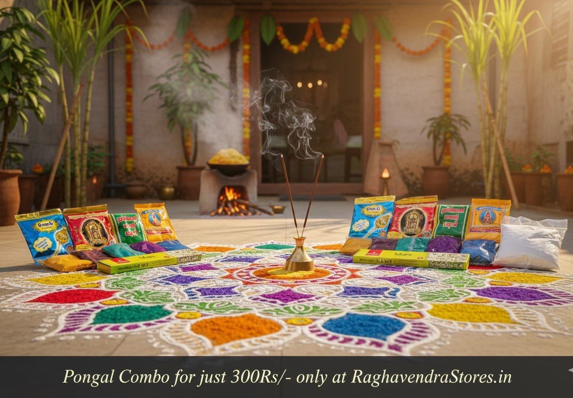 Celebrate the essence of Pongal with a combo that honors both the earth and the divine. This package features the essential elements of a South Indian household during the festival: the purity of Vibhuthi, Kumkum, and Turmeric for rituals, the fragrance of Agarbathi to cleanse the air, and a full decor set including Kolam powder, vibrant Rangoli colors, and traditional Saani powder. It is a one-stop solution for families looking to observe the four days of Pongal with authenticity, convenience, and grace.