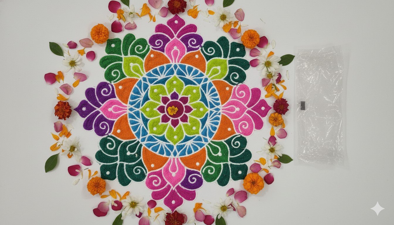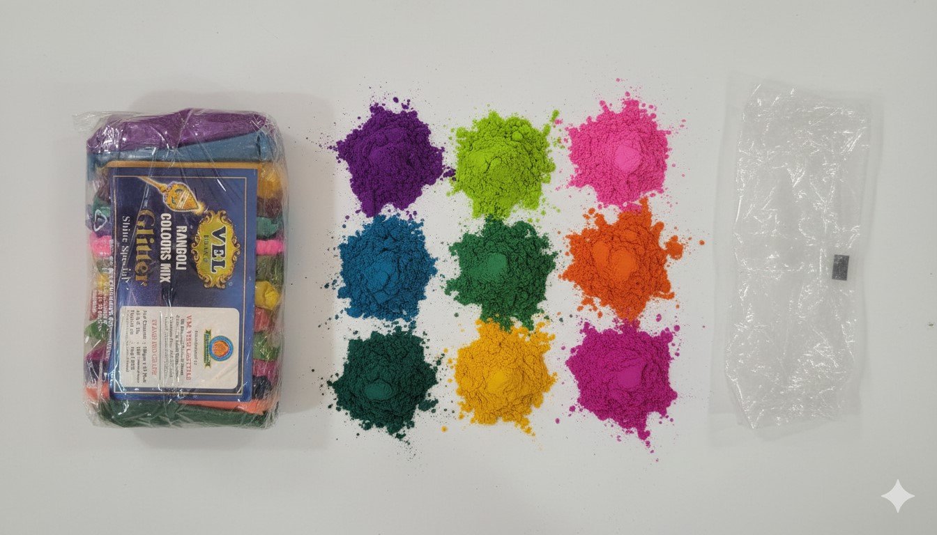 • Glitter Shine Special: Each particle is infused with a shimmering glitter finish. When the lamp light hits your rangoli, it will sparkle and shine, guaranteeing an eye-catching and festive look that truly stands out from the rest!